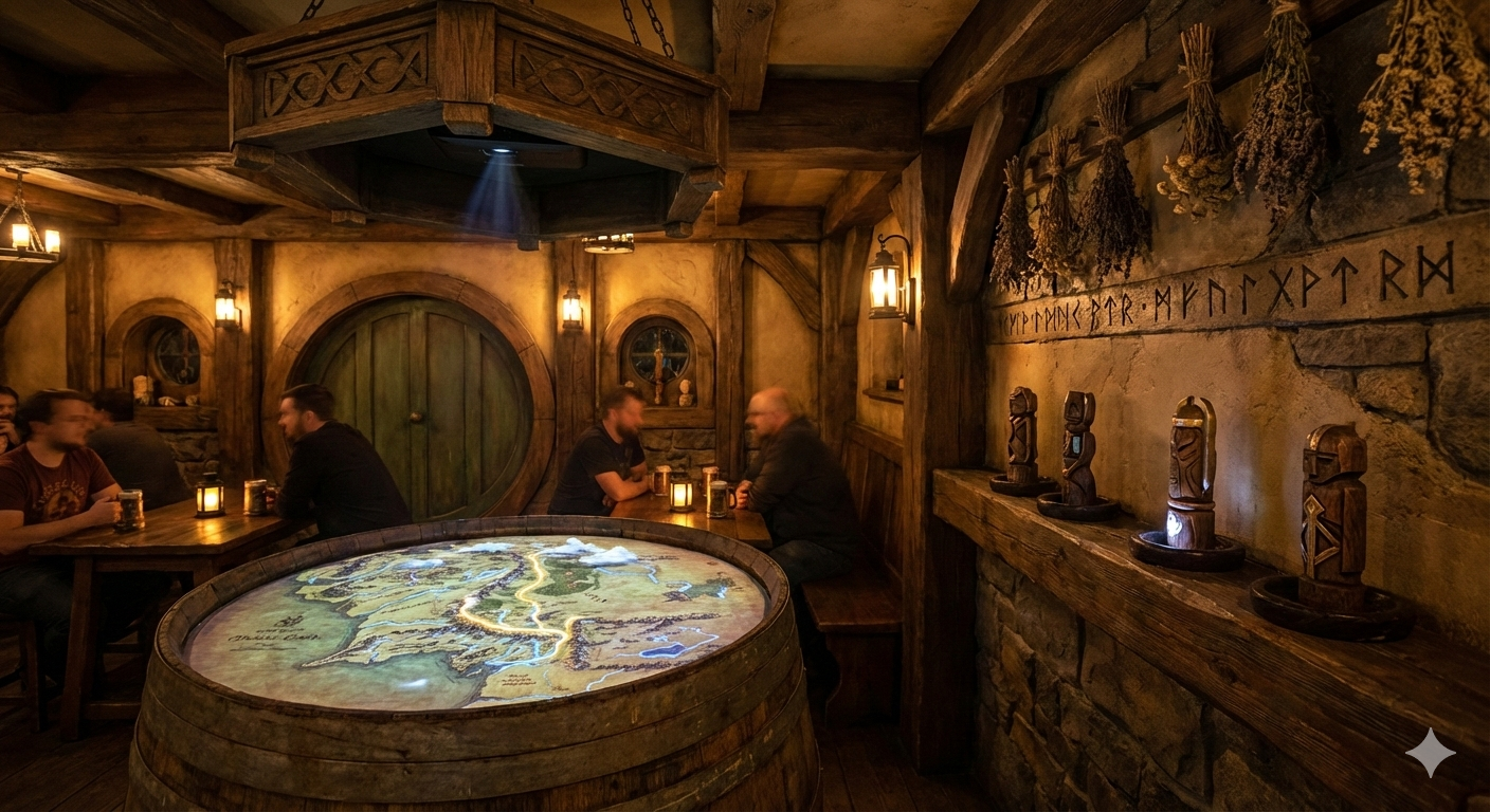 For my version of the bar, I wasn’t going for an exact recreation of The Green Dragon - more like an intentional “theme park” version of it. I wanted to include craft cocktails that I enjoy making, even though that doesn’t 100% fit with what would be served in the Shire, so I modernized certain details like some of the branding/logo work and some of the magical Imagineering touches, to stay consistent with my slightly modern take on the Middle Earth theme. It’s like if Bilbo retired from adventuring and used his gold to build a cozy classy bar someplace with a little more population than Bree.
