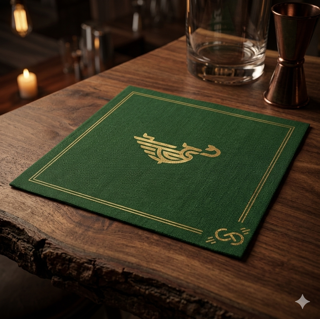 Taking a cue from a bar I visited on a trip to Belgium and the existing logo for the actual Green Dragon, I cobbled together a modified version that fit the style I was going for. Since I wanted to have a tiny splash of modernity to fit my frivolous custom cocktails, I developed a simple lettermark that had a slightly art deco feel to it. I wanted it to feel like an upscale cocktail lounge version born of the Green Dragon’s pub-centric origin. Most of the branding imagery is subtle, constrained primarily to details of napkins and custom ice molds, so that way things didn’t feel too modern.